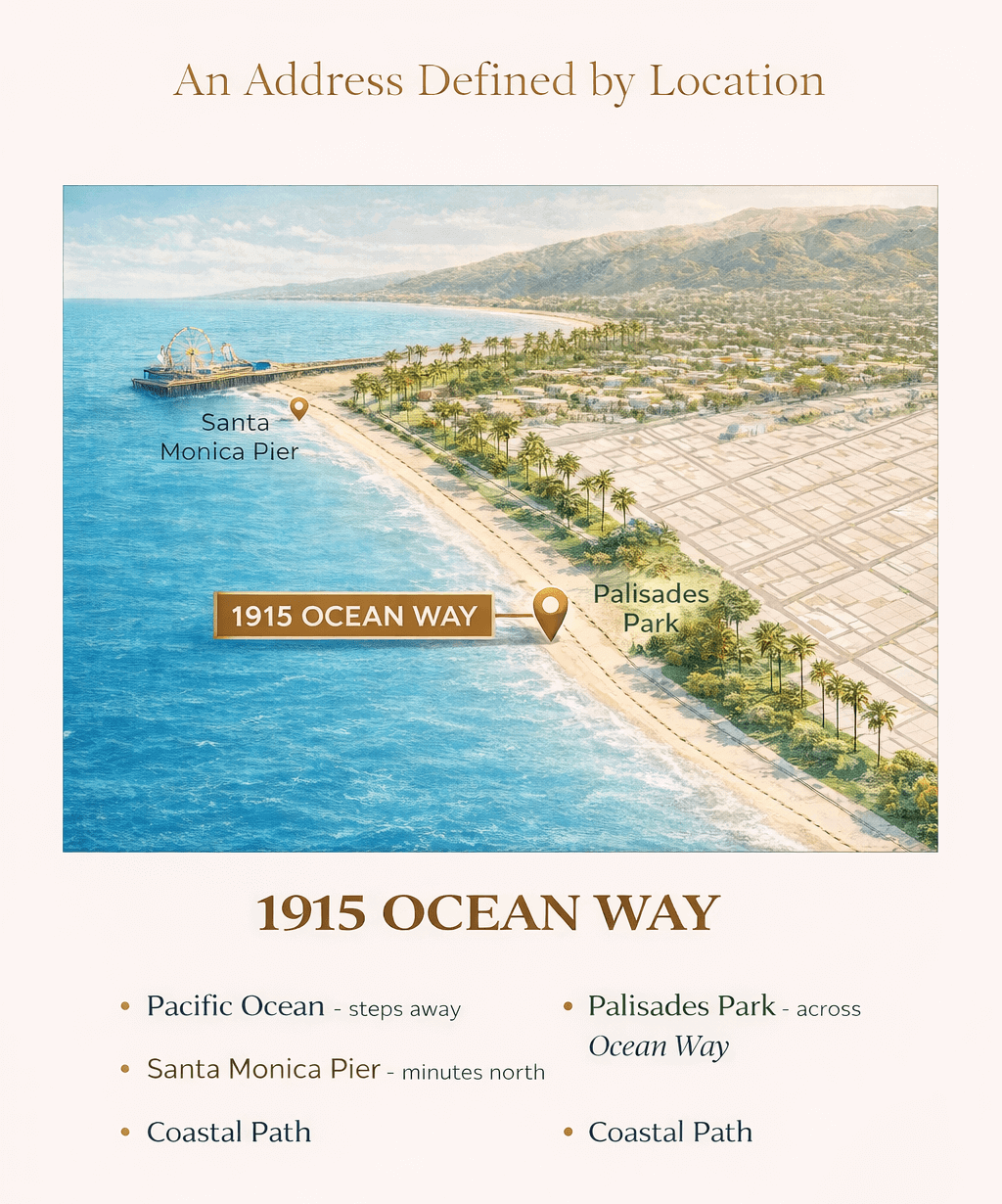 Nestled just footsteps away from the renowned Santa Monica Beach, and across the street from Casa del Mar Hotel and Shutters on the Beach, near Santa Monica Pier, the Third Street Promenade, serene Palisades Park, and Downtown Santa Monica, right near 2026 World Cup events, and 2028 Olympic beach festivals, this exquisite residence offers unparalleled convenience and luxury. Embrace a lifestyle where every destination is within easy walking distance, allowing you to immerse yourself in the vibrant energy and beauty of Santa Monica effortlessly.